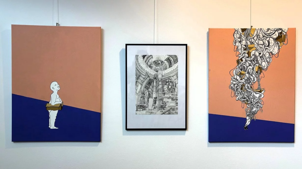 Eine gute Reise besteht immer aus Umwegen. Wir begegnen Giraffen mit Irokesen-Schnitt und Kartongeistern, die der Logistik entfliehen. Unterwegs verschmelzen die Künstler Joost-Henrik Becker und Azim F. Becker Realität mit einem Mix aus Graphic Novel, Urban Art, Expressionismus und Comic. In ihren skurrilen Bildwelten und Figuren steckt stets ein Gefühl – manchmal verborgen, manchmal überdeutlich. Ein schräger Weg verlangt nach einer schrägen Zeichnung, ein emotionaler Weg ebenso.